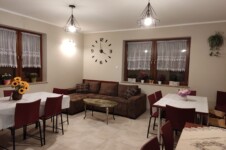 Przestronny salon gdzie można zjeść posiłki, jak również oglądać wspólnie tv, miejsce to przeznaczone do integracji oraz wypoczynku w zimowym okresie i przy brzydkiej pogodzie przez lato.