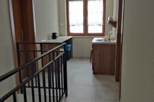 Zestaw kawowy i czajnik, filiżanki, lodówka w aneksie kuchennym na korytarzu, do dyspozycji wyposażona w niezbędne akcesoria kuchnia.